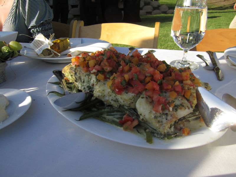 | deliciously grilled halibut over string beans. |